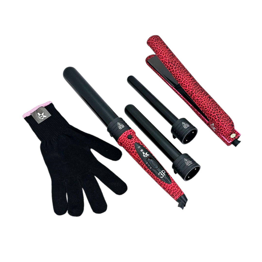 Turn heads with the KOR Pink Cheetah Hair Styling Kit, featuring a matching ceramic straightener, curling wand, and styling iron. Designed with 100% ceramic technology, each tool ensures smooth, frizz-free results while protecting your hair from heat damage. With its bold cheetah print and professional performance, this all-in-one kit is perfect for every look—backed by a 3-year warranty for lasting confidence.